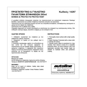 Η μοναδική σύνθεση πολυμερούς σιλικόνης του προστατευτικού και γυαλιστικού επιφανειών Flamingo διεισδύει, προστατεύει και γυαλίζει επιφάνειες πλαστικού, βινυλίου και καουτσούκ.